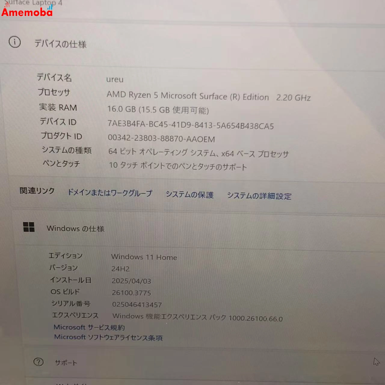 Surface Laptop 4 13.5インチ Ryzen 5 2.20GHz 16GB 256GB 1958 極美品 プラチナ (Alcantara)